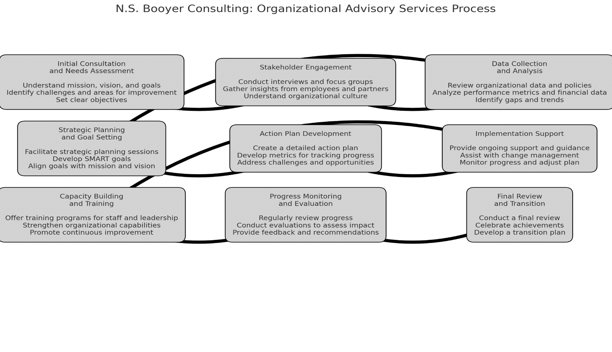 The N.S. Booyer Consulting Organizational Advisory Services Process outlines each step with key actions and goals, providing a comprehensive overview of our approach to empowering individuals.